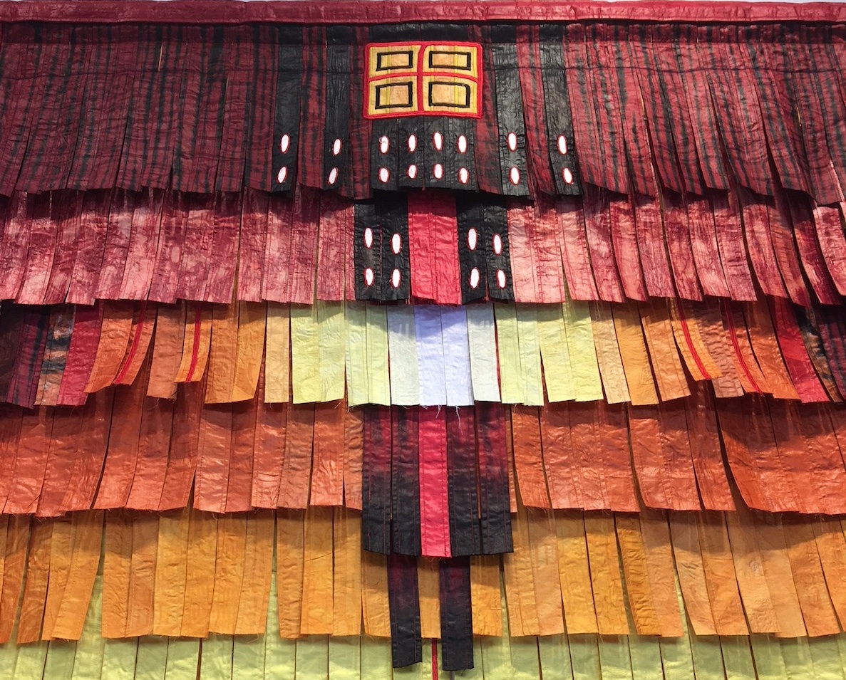 Within Konaté’s textile compositions we are confronted with fabric as paint and fabric as sculpture. They offer a very sophisticated play between surface and depth. In Elsa Guily’s words, “Viewed face on, the accumulation and superimposing of strips creates a surprising optical effect and makes us think o the touch of a paintbrush. Exploring the esthetic wealth of the textile cloth, its delicate visual and tactile qualities, Konaté works with it in a painterly manner.”